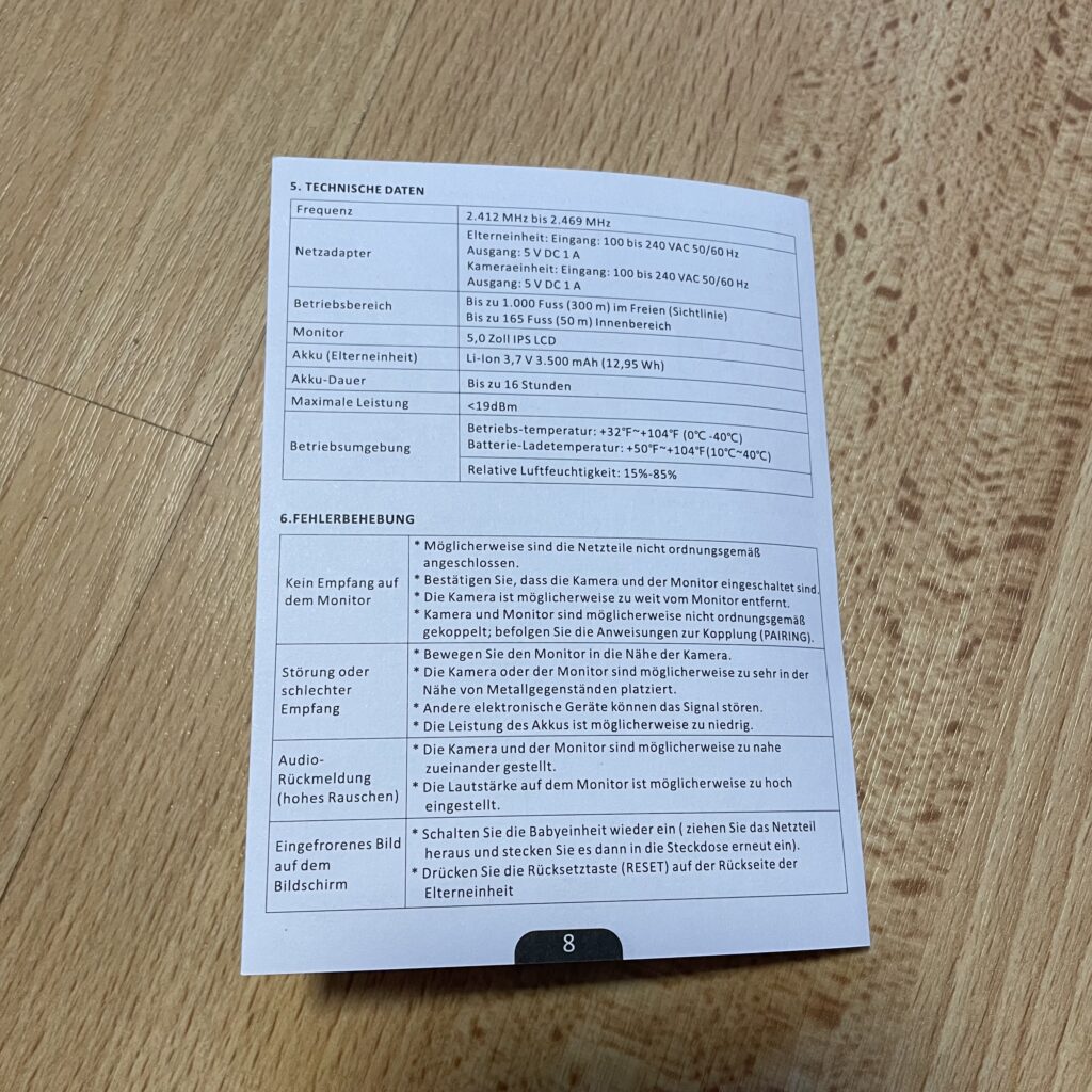 Ein großer Pluspunkt war die Akkulaufzeit: Über 16 Stunden im Videomodus und mehr als 30 Stunden im reinen Audiobetrieb sind machbar und Werte, die mit den Herstellerangaben übereinstimmen. Die Kamera wird über ein Netzteil betrieben, während die Elterneinheit mit einem integrierten Akku läuft. Das Gerät ist sofort einsatzbereit. Es wird vorkonfiguriert geliefert, eine App- oder WLAN sind nicht nötig. Die Menüführung ist logisch und die Anleitung verständlich und bebildert. Auch eine Wandmontage ist möglich, falls die Kamera stationär genutzt werden soll.