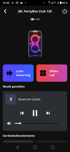 Das Gesamtgewicht des Lautsprechers beträgt 11,1 Kilogramm. Dies ist zwar nicht leicht, doch der herausklappbare Tragegriff ermöglicht einen bequemen Transport mit einer Hand. Zudem sorgt das Gewicht für eine hohe Standfestigkeit. Als Party-Lautsprecher bietet der Club 120 einige spezielle Funktionen, die im Verlauf dieses Tests näher beleuchtet werden. Zur Nutzung stehen sowohl Bluetooth in der Version 5.4 als auch ein 3,5-Millimeter-Klinkeneingang zur Verfügung. Das Koppeln mit einem Smartphone gelingt auf Anhieb; die App ist für den Betrieb nicht zwingend erforderlich, bietet jedoch zusätzliche Einstellmöglichkeiten.
