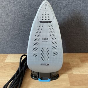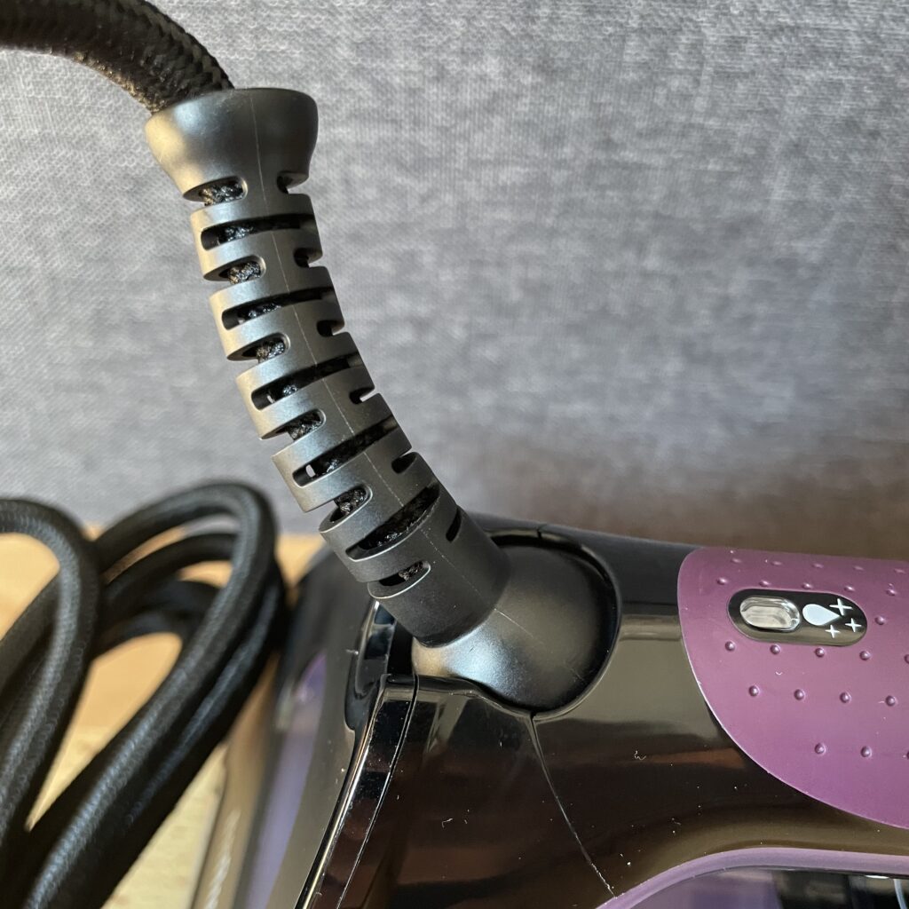 Das Gewicht von 1,7 Kilogramm sorgt für eine stabile Führung, ohne den Arm zu belasten. Besonders angenehm ist das lange Kabel, das mit einem Kugelgelenk am Gerät befestigt ist. Diese Lösung verhindert Kabelbruch und erhöht die Bewegungsfreiheit beim Arbeiten. Im Praxistest überzeugte das Bügeleisen durch eine gleichmäßige Dampfleistung. Mit einer Dampfdauerleistung von bis zu 60 Gramm pro Minute ließen sich Alltagskleidungsstücke schnell glätten. Der Dampfstoß von bis zu 250 Gramm pro Minute war stark genug, um selbst tiefe Falten in Jeansstoffen oder dichten Baumwollgeweben zu beseitigen.