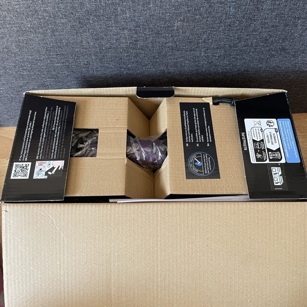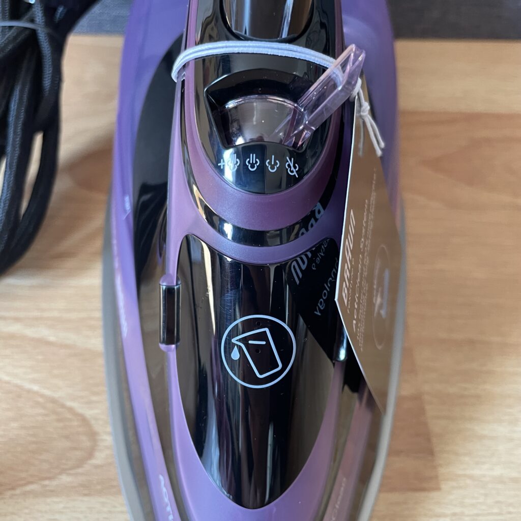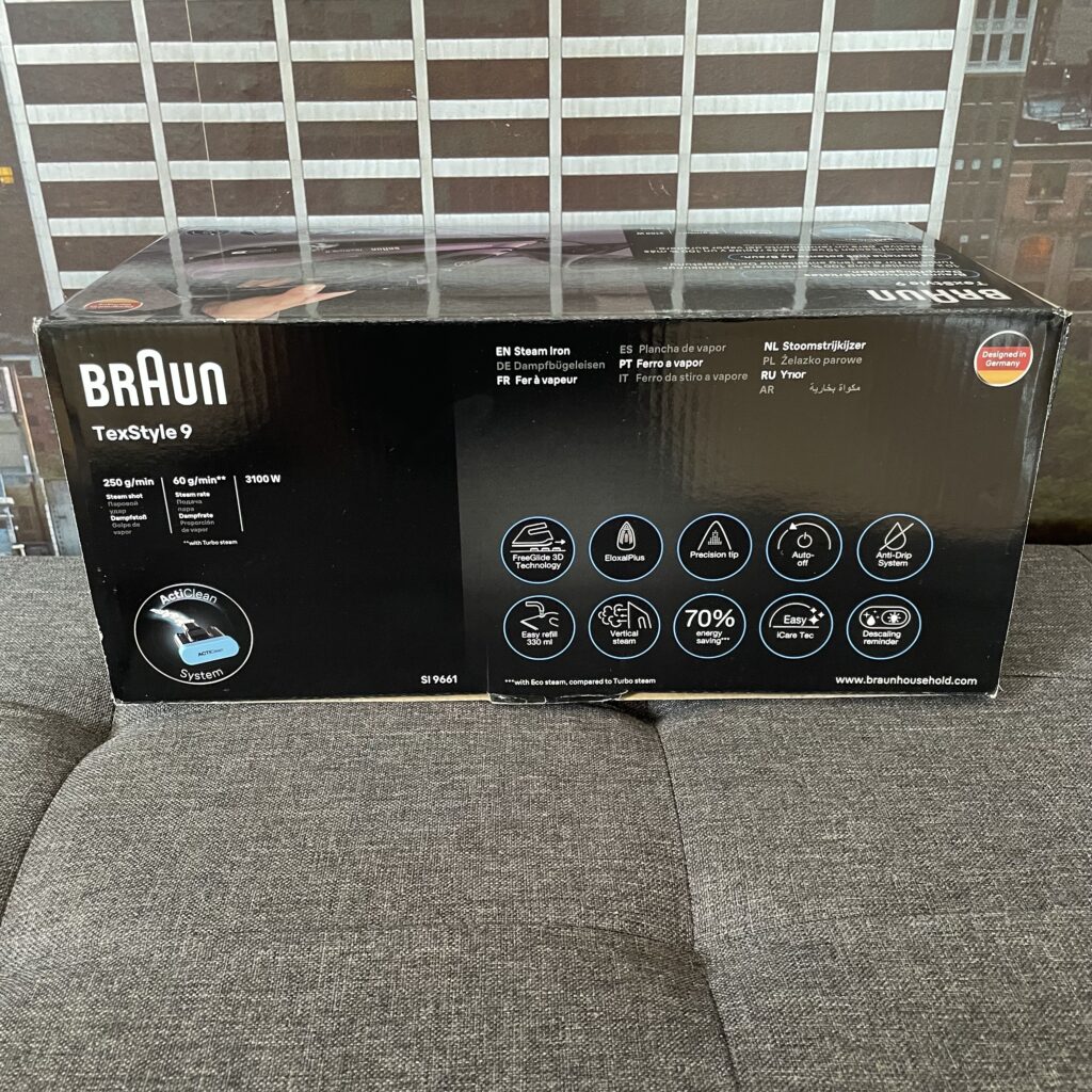 Beim Öffnen der Verpackung zeigte sich ein aufgeräumtes Bild: Das Braun TexStyle 9 SI9661VI lag sicher verstaut im Karton, ergänzt durch einen Messbecher ohne Skala sowie die Bedienungsanleitung. Eine integrierte Kabelaufbewahrung oder zusätzliches Zubehör waren nicht enthalten. Schon auf den ersten Blick fiel die Farbvariante Violet auf, die dem Bügeleisen ein modernes und hochwertiges Erscheinungsbild verleiht. Mit seinen Maßen von 32 Zentimetern in der Länge, 14 Zentimetern in der Breite und 15 Zentimetern in der Höhe sowie einem Gewicht von 1,7 Kilogramm wirkt das Gerät robust, ohne klobig zu sein.