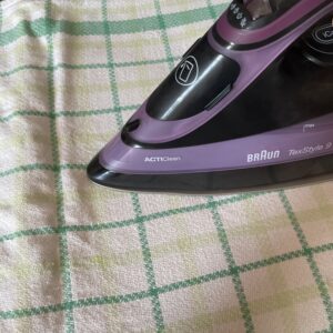 - Feuchtes Geschirrtuch: Ein Geschirrtuch befeuchtet oder mit Essig getränkt auf den Fleck legen und darüber bügeln.