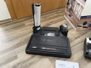 Das Lieferpaket umfasst neben dem Dampfreiniger mit Nass- und Trockensaugfunktion auch eine Bürstenwalze, einen Trockenfilter sowie eine Reinigungsbürste für den Schmutzwasserbehälter und die Bürstenkammer. Eine Dockingstation und eine detaillierte Bedienungsanleitung sind ebenfalls enthalten. Der Reiniger ließ sich mühelos zusammenbauen, sodass keine langen Lesezeiten der Anleitung erforderlich waren. Die Bedienung des Saugwischers erwies sich als intuitiv. Der Tineco zeigt eine qualitativ solide Verarbeitung: Frischwasser- und Schmutzwasserbehälter sitzen sicher und lassen sich einfach entnehmen. Mit einem Gewicht von 6,5 Kilogramm und Abmessungen von 23 x 30 x 110 Zentimetern ist das Gerät gut handhabbar.
