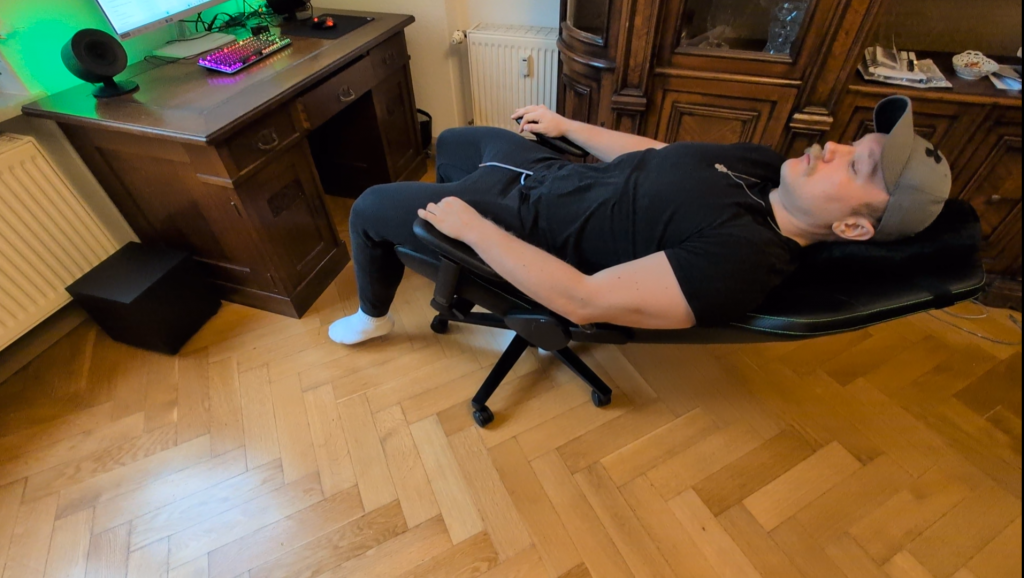 In puncto Ergonomie ist der Razer Iskur V2 anderen Gaming-Stühlen im Test überlegen. Die verstellbaren vierdimensionalen Armlehnen lassen sich in Tiefe, Breite, Höhe und Winkel anpassen, was die Arme in unterschiedlichen Sitzpositionen stützt und die Nackenmuskulatur entlastet. Obwohl keine funktionale Kopfstütze vorhanden ist, bietet ein komfortables Nackenkissen aus Memory-Schaum zusätzlichen Komfort. Das Zurücklehnen stellte sich ebenfalls als angenehm heraus. Der Neigungswinkel der Rückenlehne beträgt bis zu 170 Grad, was in Kombination mit einer passenden Fußablage eine vollwertige Liegeposition ermöglicht.