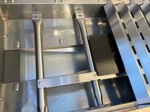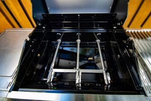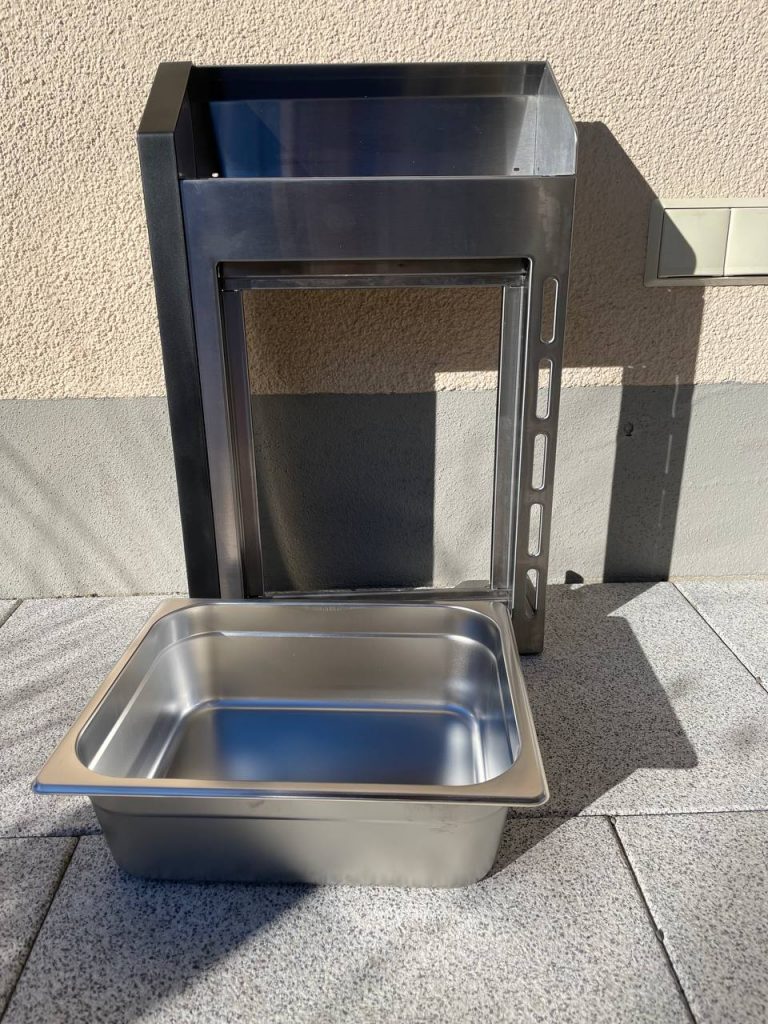 Auf der rechten Seite verbirgt sich unter der klappbaren Ablage ein Seitenbrenner mit Deckel, auf dem Saucen, Beilagen oder Bratkartoffeln direkt am Grill zubereitet werden können. Die linke Ablage beherbergt dagegen durchdachte Details: einen GN-Food-Container zur Aufbewahrung von Zutaten und ein Schneidebrett aus Akazienholz. Unterhalb der Ablagen befinden sich vier Haken für Grillbesteck, ein Gewürzkörbchen sowie ein integrierter Flaschenöffner. Im Test fiel auf, dass das Gewürzkörbchen etwas ungünstig platziert und dadurch schwer zu erreichen ist. Das ist der einzige kleine Kritikpunkt an der praktischen Ausstattung.