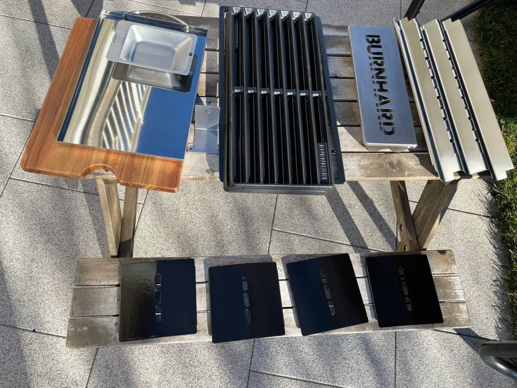 Der Burnhard Big Fred Deluxe 2023 ist die konsequente Weiterentwicklung eines bewährten Modells. Neben drei Hauptbrennern, Sear-Zone und Seitenkocher erweitert der Infrarot-Heckbrenner das Einsatzspektrum deutlich. Die große Grillfläche ermöglicht paralleles Arbeiten, das Zubehörpaket mit Smoker-Box, Food-Container, Akazienbrett und Abdeckhaube ist überdurchschnittlich. Abstriche gibt es nur wenige. Der Drehspieß ist optional, ein Sichtfenster fehlt und die Keramik-Sear-Zone belegt die Rostfläche.