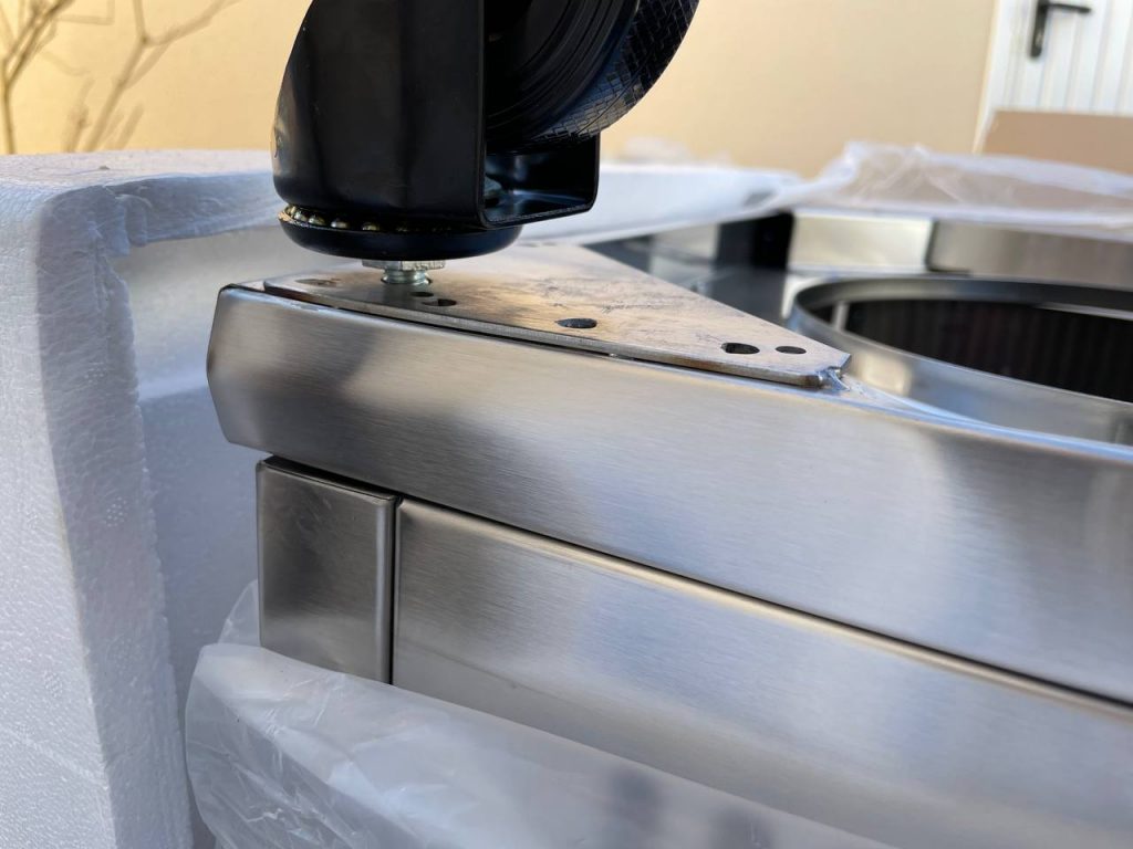 Die Konstruktion ist solide und durchdacht: Im Unterschrank lässt sich eine 11-Kilogramm-Gasflasche sicher verstauen, daneben bieten zwei senkrechte Fächer ausreichend Platz für Grillzubehör. An der linken Seite befindet sich der Infrarotbrenner mit Deckel – im Ruhezustand dient er als zusätzliche Arbeitsfläche. Rechts steht eine zweite, klappbare Ablage zur Verfügung. Insgesamt zwölf Haken und ein verstellbares Gewürzregal sorgen für Ordnung beim Grillen.