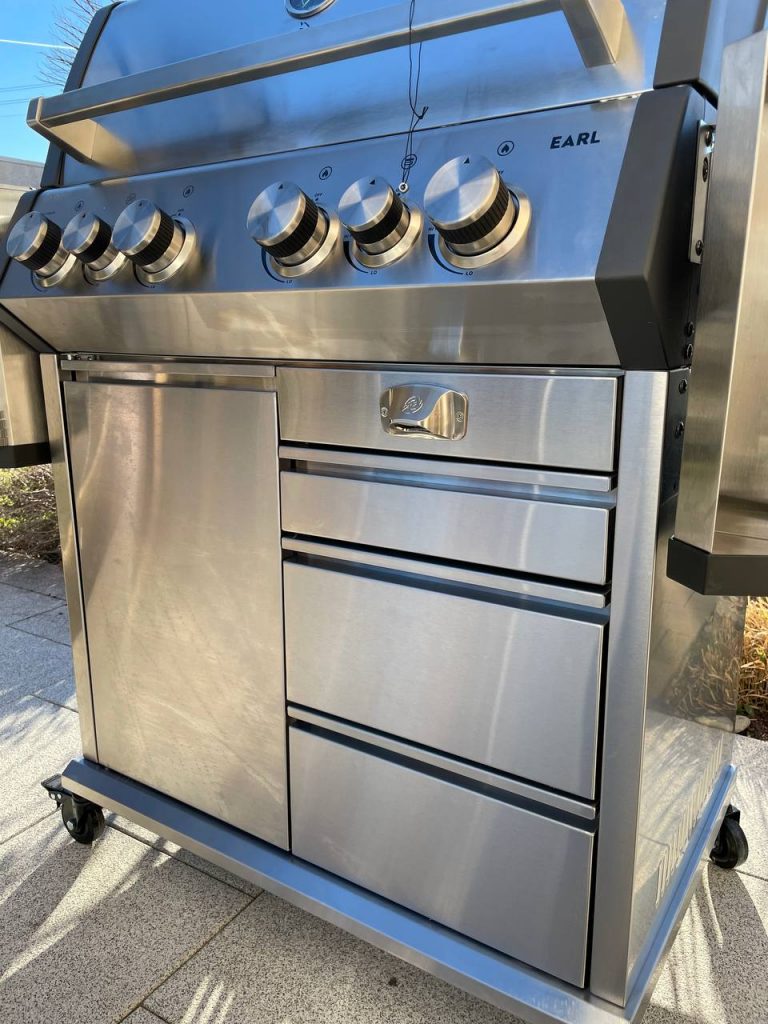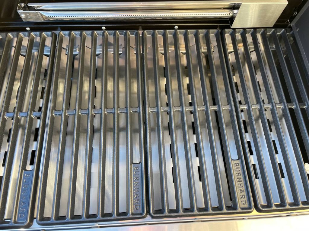 Im Test zeigte der Burnhard Earl Royal Series 4-Brenner, warum er zu den beliebtesten Premiumgrills zählt. Die vier Hauptbrenner lieferten innerhalb weniger Minuten eine enorme Hitze, die sich gleichmäßig über die Grillfläche verteilte. Die gusseisernen Roste erzeugten kräftige Grillstreifen und eine stabile Kruste, ohne das Fleisch auszutrocknen.