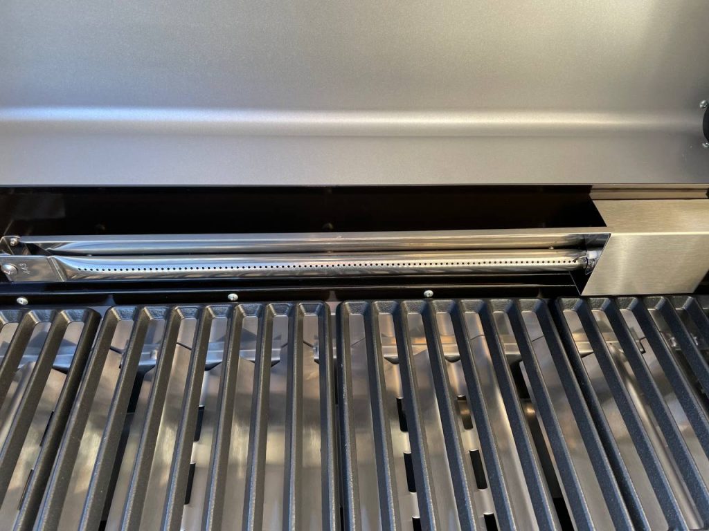 Mit geschlossenem Deckel erreicht der Grill innerhalb kurzer Zeit 350 Grad Celsius. Der Infrarotbrenner überzeugte beim scharfen Anbraten von Steaks, auch wenn seine Position auf der linken Grillseite etwas nutzbare Fläche kostet. Die dreiteilige Grillfläche aus Gusseisen misst 72 × 41,5 Zentimeter und gewährleistet Platz für mehrere Speisen gleichzeitig. Wer möchte, kann den Grillrost als Edelstahlvariante erwerben. Darüber befindet sich ein Warmhalterost (64 × 18 Zentimeter), der sich im Test als nützlich erwies, um bereits gegartes Grillgut zwischenzuparken.