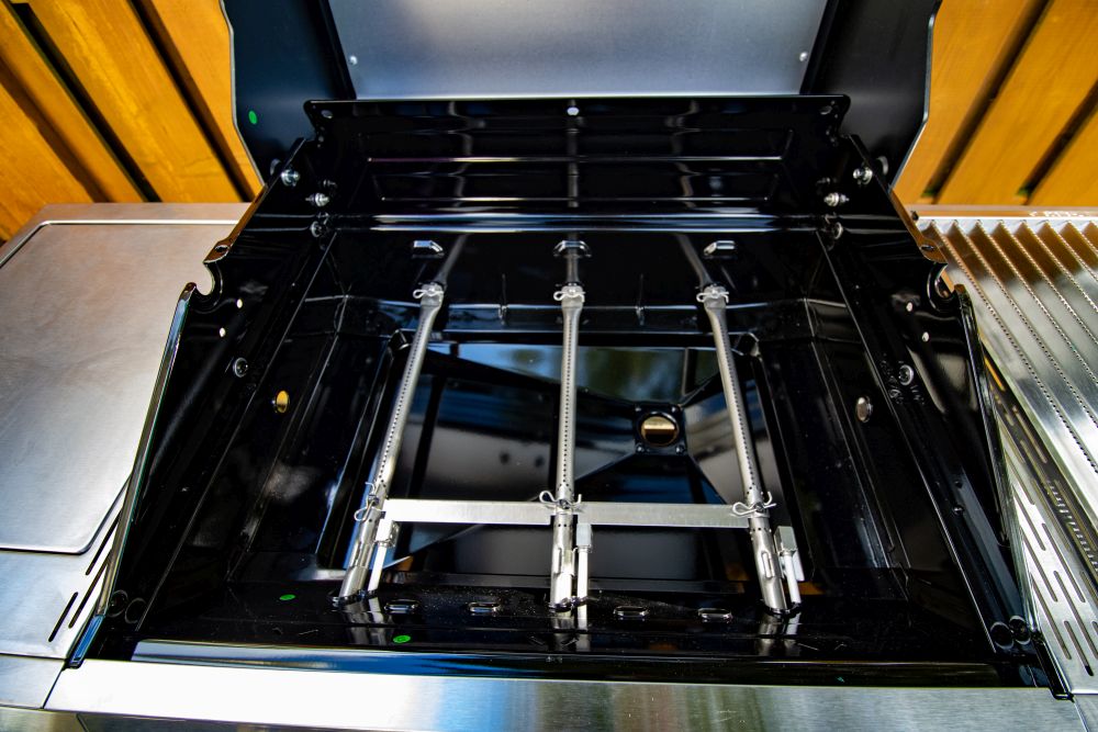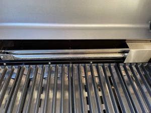 Der Grill verfügt über fünf Brenner mit einer Gesamtleistung von 17 Kilowatt. Dazu gehören drei Hauptbrenner mit je 3,5 Kilowatt Leistung und W-Shape Flavor Bars, ein Infrarot-Keramikbrenner (3,5 Kilowatt) für extreme Temperaturen bis 900 Grad Celsius sowie ein Seitenkocher mit 3 Kilowatt Leistung. Alle Brenner lassen sich stufenlos regulieren und über die integrierte Piezozündung direkt an den Edelstahl-Drehreglern starten. Im Praxistest funktionierte der Vorgang zuverlässig und sicher.