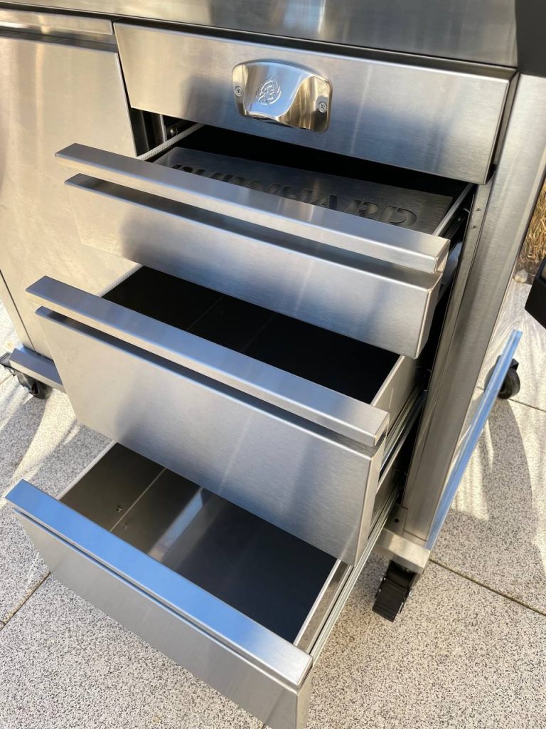 Das Zubehörpaket ist außergewöhnlich umfangreich. Zum Lieferumfang gehören eine Smokebox, vier Zubehörhaken, eine wetterfeste Abdeckhaube, ein GN-Behälter mit 6 Litern Volumen, ein Druckminderer, ein Gasschlauch und eine Fettauffangschale. Burnhard liefert also fast alles für den sofortigen Einsatz mit. Der Grill bietet großzügigen Stauraum. Im unteren Bereich befinden sich drei rollengeführte Schubladen, die sich leichtgängig öffnen lassen und reichlich Platz für Grillzubehör, Besteck oder Gewürze bieten. Rechts daneben liegt der Gasflaschenbereich, in dem 5-, 8- oder 11-Kilogramm-Flaschen sicher fixiert werden können.