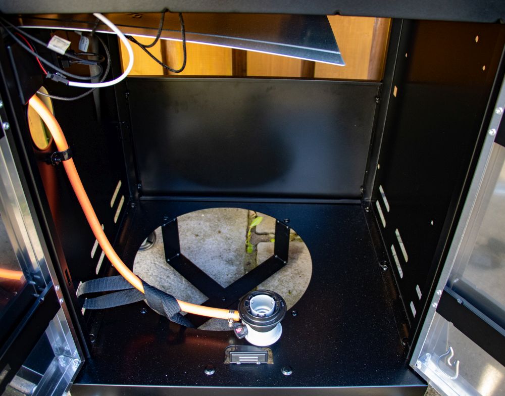 Im Unterschrank findet eine 11-Kilogramm-Gasflasche (alternativ 5 oder 8 Kilogramm) Platz. Ein verstellbarer Sicherungsgurt mit Steckverschluss an der rechten Seitenwand hält die Flasche beim Rangieren zuverlässig. Verkabelung und Gasanschluss sind in der Anleitung klar beschrieben, inklusive Schritt-für-Schritt-Hinweisen zur Dichtigkeitsprüfung. Für die Zündung ist eine AA-Batterie erforderlich, die nicht anbei liegt, Schläuche und Druckminderer sind dagegen im Paket.