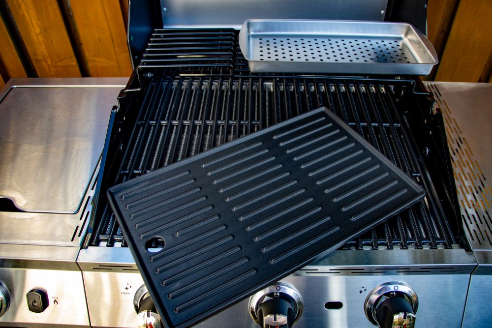 Der dreiteilige Gusseisenrost misst 70 × 40 Zentimeter. Über den drei Hauptbrennern liegen Edelstahl-Flavour Bars, die Tropffett abfangen und Flammenbildung reduzieren. Darunter führt ein Fettablaufblech in die herausziehbare Edelstahl-Auffangschale. Beide lassen sich zur Reinigung einfach nach hinten entnehmen.