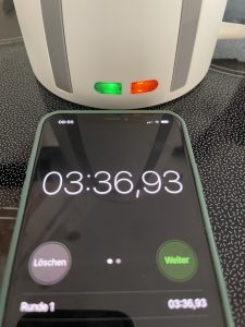 Nach dem Auspacken wurde die Bedienungsanleitung studiert. Diese war zwar ohne Bilder, aber chronologisch und inhaltlich klar strukturiert. Auf den Hinweis hin, maximal 250 Milliliter Wasser in das Gerät zu füllen, fiel sofort der erste Nachteil auf: Der Messbecher fasst nur maximal 175 Milliliter. Eine Nachfüllung war erforderlich, um die angegebene Menge zu erreichen. Mithilfe des Trichters gelang das Einfüllen problemlos. Nach der vom Hersteller angegebenen Aufheizzeit von 3 bis 4 Minuten, die mit präzisen 3 Minuten und 12 Sekunden bestätigt wurde, erlosch die rote Betriebskontrollleuchte.