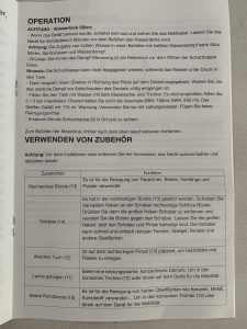 Im Lieferumfang enthalten sind eine Fensterdüse mit Tuch, eine flexible Verlängerung, eine Rundbürste, eine Einspritzdüse, ein Trichter sowie ein Spenderaufsatz. Das Zubehör ließ sich unkompliziert anbringen und saß im Test zuverlässig fest. Ein Messbecher ist ebenfalls vorhanden, allerdings nur mit 175 Millilitern Fassungsvermögen, wodurch er nicht für die komplette Tankbefüllung ausreicht. Mit der flexiblen Verlängerung ließen sich schwer zugängliche Stellen oder schmale Zwischenräume gut erreichen.