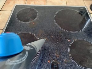 Der Praxistest begann mit der Reinigung eines Cerankochfeldes. Vor den Testdurchgängen wurde Tomatensoße auf der Herdplatte verteilt und einige Stunden antrocknen gelassen. Zuerst wurde die Punktstrahldüse zum Lösen der Soßenreste verwendet. Die Qualität und die einfache Handhabung des Zubehörs sowie der hohe Druck überzeugten. Vor dem Dampfausstoß musste zuerst die Kindersicherung am Handgriff per Tastendruck gelöst werden. Der Dampfausstoß war im Vergleich zu anderen Testgeräten deutlich stärker. Wie auf dem Foto zu sehen ist, verteilte sich der Dampf über die gesamte Herdoberfläche und die Soßenreste konnten einfach abgelöst werden. Anschließend wurde die Handdüse mit dem Mikrofaserbezug für die Endreinigung des Cerankochfelds verwendet. Auch dieses Ergebnis überzeugte.