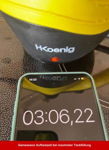 - Gemessener kontinuierlicher Dampfausstoß: Bei einer Wassermenge von 200 Millilitern betrug die Zeit 5:37 Minuten