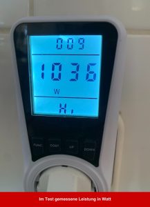 - Leistung in Watt: Der Hersteller gibt 1.050 Watt an, das Messgerät verzeichnete jedoch nur 768,2 Watt.
