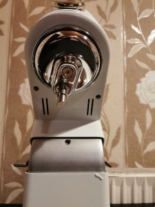 Der Hebel zur Entriegelung des Rührarms befindet sich gut erreichbar auf der Rückseite der Kenwood-Küchenmaschine. Der Gerätearm ließ sich problemlos hochklappen. Bei hochgeklapptem Arm gestaltet sich die Montage der Rührschüsseln und Aufsätze durch Eindrehen und Festhaken als unkompliziert. Das System wirkt stabil und haltbar; nach der Installation sitzt alles fest. Zum Herunterklappen muss der Hebel gesichert betätigt werden, wodurch ein versehentliches Herunterklappen verhindert wird. Die Maschine kann nur eingeschaltet werden, wenn der Arm sowohl unten als auch oben eingerastet ist. Diese Sicherheitsfunktion ist besonders wichtig.