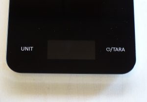 Die Waage ist mit 23,5 Zentimetern Länge, 16 Zentimetern Breite und 1,65 Zentimetern Höhe schlank gebaut. Gleichzeitig bietet sie eine ausreichend große Stellfläche für kleine und große Behälter. Sie trägt bis zu 5 Kilogramm. Das LCD-Display ist direkt in die Oberfläche integriert und zeigt das Gewicht gut ablesbar an. Bedient wird über die zwei Touch-Tasten „Tare“ und „On/Off“, die im Test zuverlässig reagierten. Dank der pflegeleichten Edelstahloberfläche lässt sich die Waage einfach reinigen.
