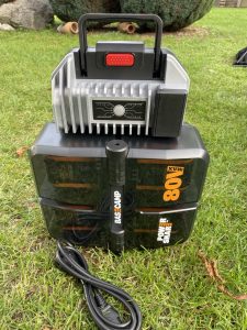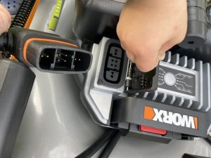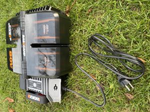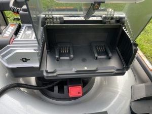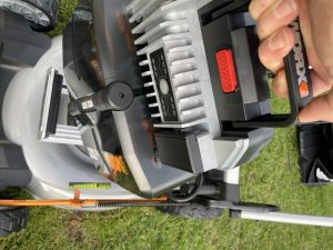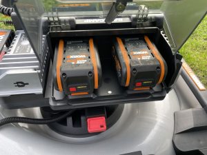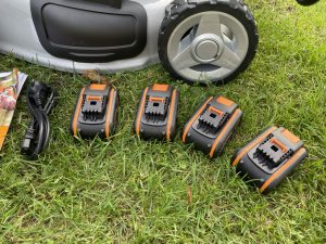 Der Rasenmäher wird mit vier 20-Volt-Akkus mit jeweils 4 Amperestunden Kapazität geliefert. Da der Motor mit 80 Volt arbeitet, müssen alle vier Akkus gleichzeitig eingesetzt werden. Das Einlegen der Akkus erfolgt schnell und unkompliziert, ein Deckel schützt die Batterien während des Betriebs. Vorteilhaft ist, dass die Akkus zum Laden nicht einzeln entfernt werden müssen. Das Akkupack kann einfach entnommen und aufgeladen werden. Die Ladezeit beträgt allerdings zwischen 4 und 5 Stunden.