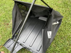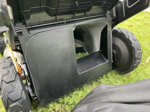 Trotz seiner Abmessungen bringt der Rasenmäher mit 16,5 Kilogramm ein relativ geringes Gewicht mit sich, was den Verzicht auf einen Radantrieb unproblematisch macht. Die großen Hinterräder und das geringe Gewicht ermöglichen ein einfaches Schieben, selbst bei leichtem Gefälle. Der große Fangbehälter fasst 60 Liter und ist mit einer Füllstandsanzeige ausgestattet.