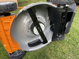 - Seitenauswurf: Schnittgut wird seitlich ausgeworfen, ideal für das spätere Einsammeln mit einem Rechen.