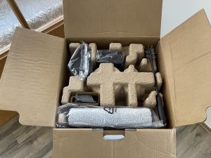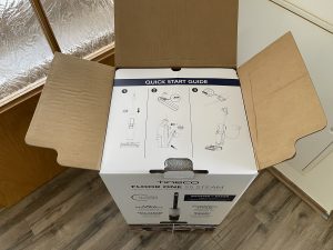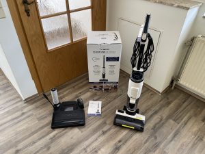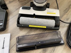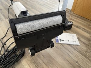 Der Lieferumfang des Flexi Pro umfasst keine unterschiedlichen Aufsätze, jedoch eine automatische Reinigungsstation, die ausführlich erläutert wird. Im Karton befanden sich der Saugwischer mit separatem Griff und Bürstenwalze, eine Reinigungsbürste sowie die Bedienungsanleitung. Der Saugwischer ließ sich in wenigen Minuten montieren und überzeugte durch ein modernes und hochwertiges Design. Weder klapprige Teile noch übermäßiges Knarzen waren festzustellen. Roborock hat in puncto Verarbeitungsqualität also überzeugt.