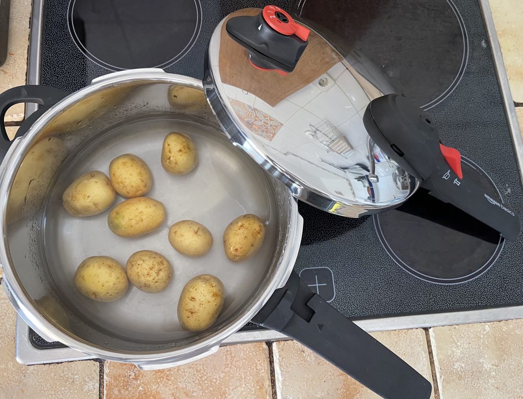 Im Praxistest waren die Pellkartoffeln nach nur 8 Minuten gar. In der Bedienungsanleitung wurde die Nutzung eines Garkorbs empfohlen, der jedoch nicht im Lieferumfang enthalten, sondern nur separat erhältlich ist. Es wurde daher ein vorhandener Garkorb genutzt. Auch bei anderen Gerichten, die im Verlauf des Testzeitraums gekocht wurden, zeigte der Topf eine gute Leistung. Für das Abdampfen stehen drei Methoden zur Verfügung: natürliches Abkühlen, schnelleres Abdampfen über den Schieberegler am Griff oder das besonders schnelle Herunterkühlen unter kaltem Wasser. In allen Varianten ließ sich der Topf nach Druckabbau problemlos öffnen. Das natürliche Abkühlen dauerte im Test rund 10 Minuten, bis beide Kochringe abgesunken waren