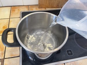 Vor dem ersten Praxistest wurden der Innentopf, die Innenseite des Deckels, der Messbecher und die Reiskelle gemäß Anleitung gründlich gereinigt. Diese Teile sind nicht spülmaschinengeeignet und müssen von Hand gewaschen werden. Nach dem Trocknen begann die Vorbereitung für Pellkartoffeln. Laut Bedienungsanleitung soll der Innentopf zwischen der 1/5- und 4/5-Markierung mit Flüssigkeit gefüllt werden. Bei Lebensmitteln, die beim Kochen aufquellen, darf die 3/5-Markierung nicht überschritten werden. Die Messskala im Innentopf ist gut sichtbar und bietet eine nützliche Orientierung. Unklar blieb jedoch, wie viel Wasser für Kartoffeln benötigt wird und welche Kochzeit einzustellen ist. Eine Tabelle für Mengen und Zeiten wäre wünschenswert gewesen.