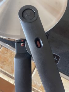 Eine Besonderheit, die sonst im Test nur der WMF Perfect One Pot bot, ist der abnehmbare Griff. An der Unterseite des Deckels befindet sich eine kleine Flügelschraube, die sich mühelos ohne Werkzeug auf- und zudrehen lässt. Dies erleichtert die Reinigung des Deckels und ermöglicht eine platzsparende Lagerung des Topfs im Schrank.