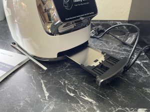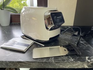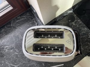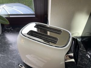 Zudem verfügt das Gerät über eine automatische Zentrierungsfunktion. Diese sorgt dafür, dass jede Brotscheibe mittig positioniert wird, egal ob dünn oder dick. Dadurch wird eine gleichmäßige Bräunung auf beiden Seiten garantiert. Auch Bagels lassen sich dank einer speziellen Bagel-Funktion einseitig toasten. Die herausnehmbare Krümelschublade ermöglichte nach dem Test eine einfache Reinigung. Das integrierte Kabelfach an der Unterseite verhinderte störenden Kabelsalat auf der Küchenzeile. Bei der ersten Inbetriebnahme war leider deutlich ein künstlicher Geruch wahrnehmbar.