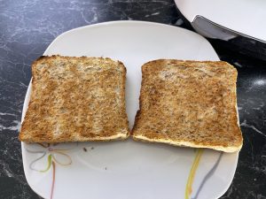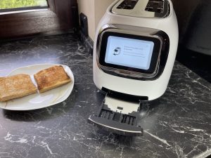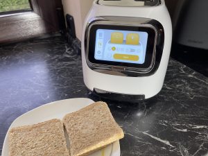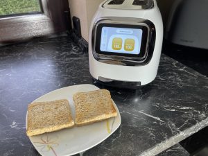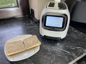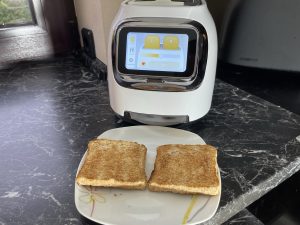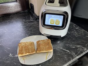 Zusätzlich punktet das Gerät mit nützlichen Sonderfunktionen. Auftauen, Aufwärmen und Stoppen lassen sich direkt über das Display aktivieren. Im Test funktionierte der Toaster zuverlässig. Es gibt einen Countdown-Timer, der die verbleibende Zeit bis zum fertigen Toast sekundengenau anzeigt. Im Test brauchte der Toaster bei mittlerem Bräunungsgrad exakt eine Minute und 50 Sekunden für die Fertigstellung. Das Toastbrot war durchweg gleichmäßig gebräunt, mit knuspriger Oberfläche und weicher Krume.