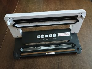 Der Vakuumiervorgang mit den Folienbeuteln gestaltete sich folgendermaßen: Der Beutel wurde befüllt und die offene Kante in den Vakuumbehälter eingelegt. Der Deckel wurde dann mit etwas Druck auf die Seiten bis zum Klickgeräusch verriegelt. Anschließend wurde die Taste „Vacuum and Seal“ betätigt. Die Lichter beider Tasten leuchteten auf, während das Gerät mit einem Brummen seine Arbeit verrichtete. Nachdem das Licht an der Seal-Taste erlosch, wurde der Deckel durch Betätigung der seitlichen Schalter geöffnet. Der frisch vakuumierte und versiegelte Beutel war bereit zur Entnahme. Mit dem 30 Zentimeter langen Band können auch sehr lange Beutel oder mehrere gleichzeitig verschlossen werden. Die Dauer für das Vakuumieren und Versiegeln variierte im Test zwischen 21 und 14 Sekunden, was im Vergleich zu anderen Geräten relativ lang ist.
