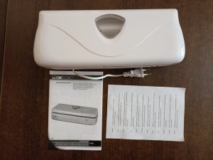 Der ProfiCook PC-VK 1080 Vakuumierer wurde in einem weißen Karton mit bunten Bildern geliefert. Eine Seite ist auf Deutsch, die andere auf Englisch beschriftet. Der Hersteller hat den Inhalt durch Kartoneinlagen geschützt. Das Gerät ist in einer Plastiktüte verpackt, ebenso wie die mitgelieferten Folienbeutel. Das glänzende Edelstahlgehäuse ist mit einem dreidimensionalen Markennamen versehen. Die vier länglichen Leuchttasten sind in englischer Sprache beschriftet. Für Nutzer, die der englischen Sprache nicht mächtig sind, bietet die Gebrauchsanweisung eine vollständige Erklärung der Funktionen in deutscher Sprache.