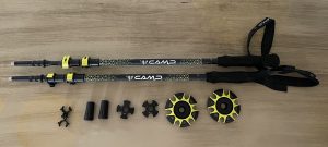Nach dem Zusammenbau der Trekkingstöcke wurden alle vorhandenen Aufsätze getestet. Die Schlamm- und Schneeteller werden auf ein Gewinde geschraubt, während die Asphaltpads gesteckt werden. Das Anbringen und Entfernen funktionierte reibungslos. An beiden Stöcken befinden sich Klettbänder zur Fixierung der zusammengefalteten Stöcke. Bei einem störenden Gefühl während des Wanderns können sie entfernt und später wieder angebracht werden.
